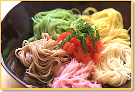 グルメでは郷土料理の一つでもある「五色そうめん」は白・赤・黄・緑・濃紺の五色からなるそうめんで、食欲をそそります。