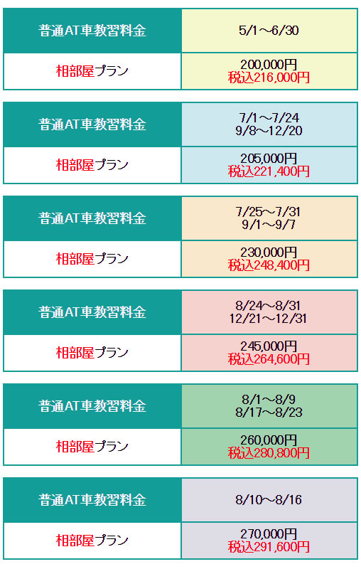 下記料金の他に、学校にて別途諸費用(教材費)5,400円(税込)および仮免試験関係費用2,800円(非課税)が必要です。