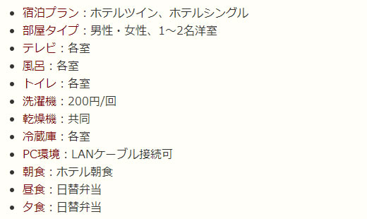教習所から徒歩10分または自転車で3分の距離にある宿舎です。客室はバス・シャワー・トイレ・テレビ・冷暖房・インターネット接続等完備で快適にお過ごし頂けます。近隣にはコンビニ・スーパー・飲食店があり大変便利です。