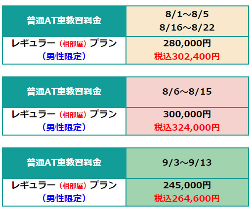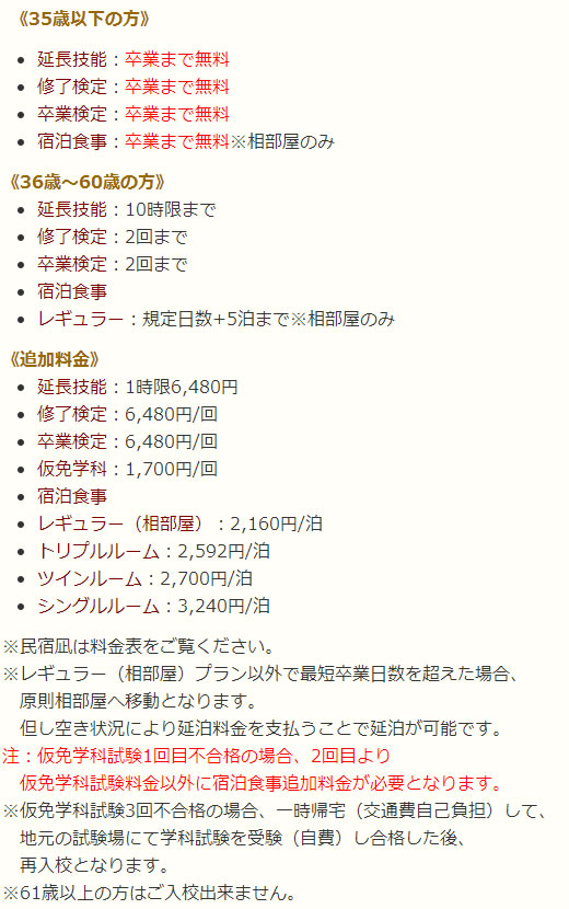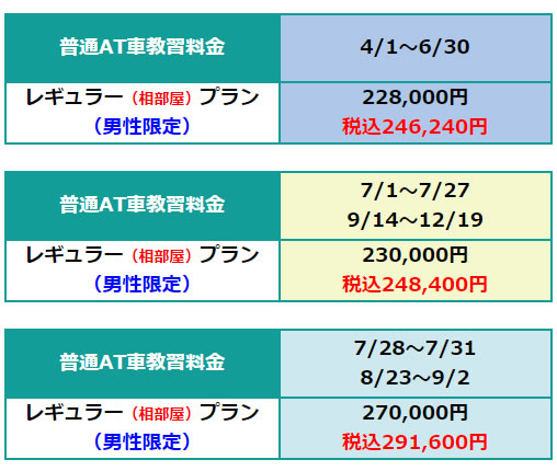下記料金の他に、学校にて別途諸費用(教材費)5,400円および仮免許試験試験手数料と仮免許交付手数料2,800円(非課税)が必要です。